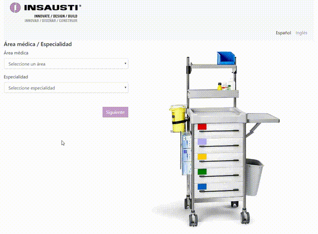 INSAUSTI ofrece una amplia gama de carros médicos con gran variedad de, tamaños, acabados y accesorios. Este configurador ofrece a sus clientes una herramienta sencilla a través de internet para configurar las múltiples opciones de su amplio catálogo.